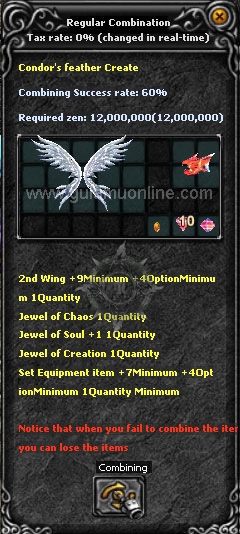 El Condor Feather es necesario para poder crear Wing Level 3 este item no dropea asi que se tiene que crear en la Chaos Machine mediante la combinacion de varios Items.