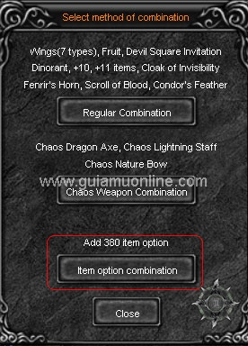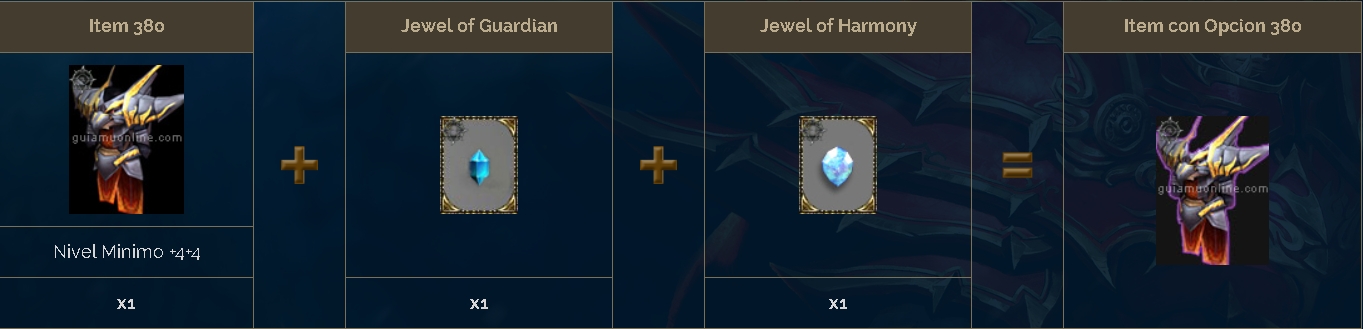 Insertar un Item 380 Nivel Minimo +4+4 Adicional, Jewel of Guardian, Jewel of Harmony y hacer click en Combining.