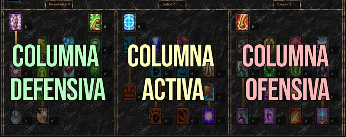 El Skill Tree tiene 3 Categorias, cada uno dividido en un rango de 1 a 8 filas.