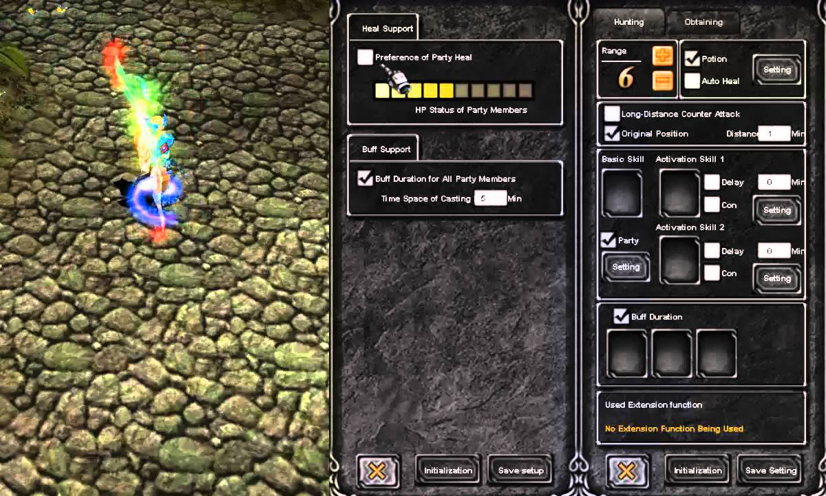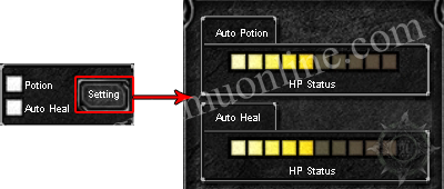 El personaje al activar la casilla Potion o Auto Heal podra configurar la auto recuperacion de HP con pociones o el Buff heal. En la casilla setting podra asignarle un valor de acuerdo a su consideracion.
